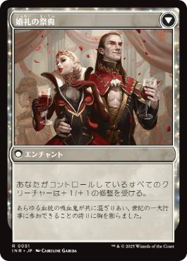 カードテキスト あなたの終了ステップの開始時に、婚礼の発表の上に招待カウンター1個を置く。このターン、あなたが2体以上のクリーチャーで攻撃していたなら、カード1枚を引く。そうでないなら、白の1/1の人間・クリーチャー・トークン1体を生成する。その後、婚礼の発表の上に3個以上の招待カウンターがあるなら、これを変身させる。
