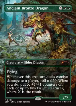 飛行 エインシャント・ブロンズ・ドラゴンがプレイヤー1人に戦闘ダメージを与えるたび、1個のd20を振る。そうしたとき、クリーチャー最大2体を対象とする。それらの上にそれぞれ+1/+1カウンターX個を置く。Xはその出目に等しい。 |