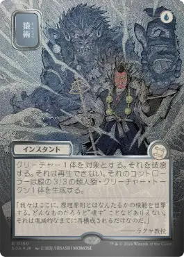 | カードテキスト | クリーチャー1体を対象とする。それを破壊する。それは再生できない。それのコントローラーは緑の3/3の類人猿・クリーチャー・トークン1体を生成する。 |