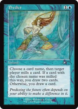 | カードテキスト | プレイヤー1人を対象とし、カード名を1つ選ぶ。その後、そのプレイヤーは自分のライブラリーの一番上のカードを自分の墓地に置く。そのカードが選ばれた名前を持つなら、あなたはカードを2枚引く。そうでないなら、あなたはカードを1枚引く。 |